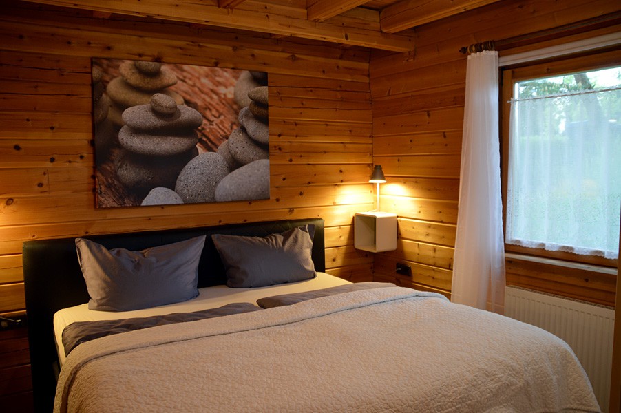 Holzhaus – 2 Doppelzimmer, eines ist davon mit Bett von 1,40m Breite (z.B. für Kinder), 1 Schlafcouch, 1 Bad