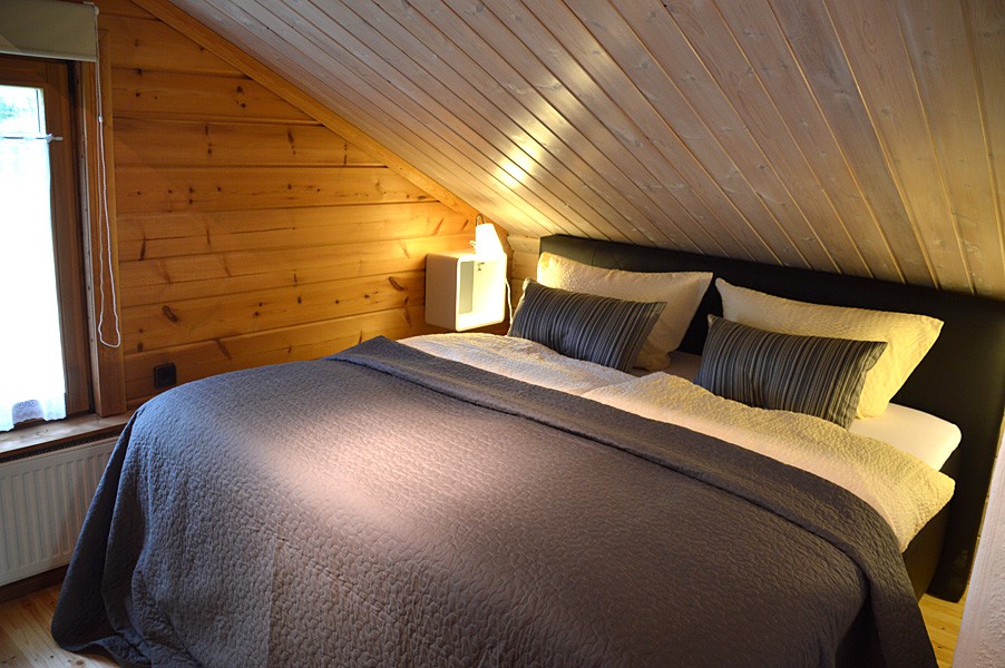 Holzhaus – 2 Doppelzimmer, eines ist davon mit Bett von 1,40m Breite (z.B. für Kinder), 1 Schlafcouch, 1 Bad